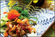 Pickled cucumbers in a light sesame dressing with seaweed salad and smoked squid